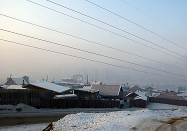 Schoolchildren like Nandin-Erdene breathe in heavily polluted air not only in the streets, but also at both school and home.  Ulaanbaatar is among the 10 most polluted cities in the world. Air pollution levels in the ger have reached dangerous levels: 2011 data showed that fine particulate matter, or PM 2.5, which increases the risk of respiratory infections among children, is usually 6–7 times higher than World Health Organization standards allow. The measurement can peak at up to 25 times the allowance, in December.